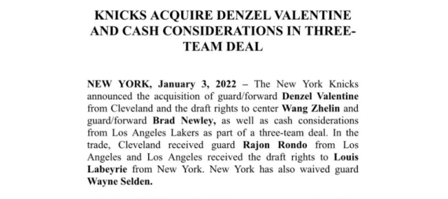 尼克斯通过这笔交易得到了瓦伦丁,这位昔日的14号秀,本赛季几乎没有太多上场时间,为骑士打了22场比赛,但场均只有9.3分钟的出场时间。不过,瓦伦丁的投篮能力不错,本赛季三分命中率达到40.9%。尼克斯随后又选择裁掉他,让他重新成为自由球员。