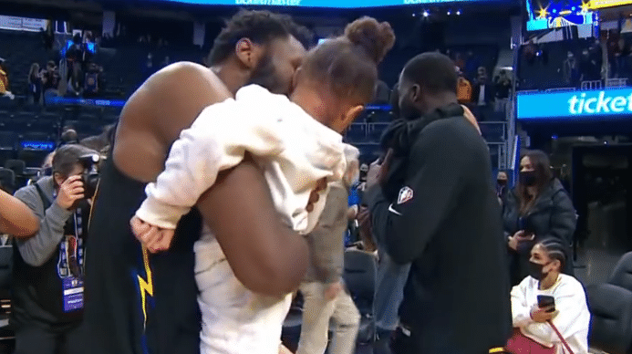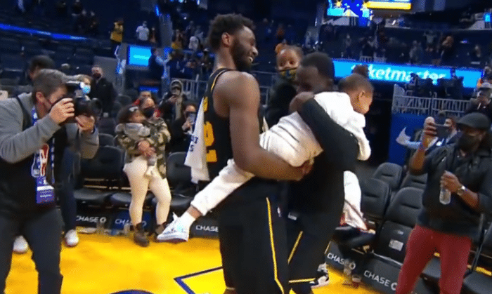 除了库里的低迷之外,这场比赛维金斯和追梦格林表现不俗,其中维金斯22分6板4助,格林5分8板13助4帽,比赛结束之后,两人都抱起了孩子,画面相当温馨。