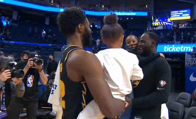 这是赛后维金斯带着女儿Amyah和追梦格林的儿子小追梦(Draymond Jr)来打招呼,追梦格林还抱了下Amyah,相当有爱。在社交媒体上,Amyah的关注度非常高。而追梦格林的儿子可是大通中心的常客,也是库里的小迷弟。