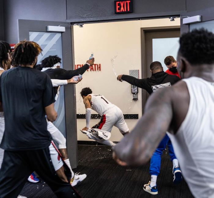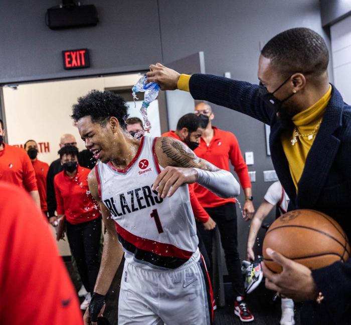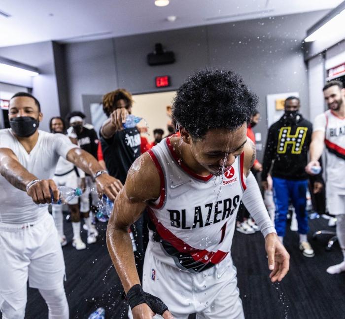 22岁西蒙斯带着沉重的心情打出疯狂一战,赛后开拓者全队疯狂泼水庆祝,利拉德等人都把水浇在他的身上,西蒙斯拔腿就跑,利拉德还把比赛用球递给西蒙斯,这是他应得的。