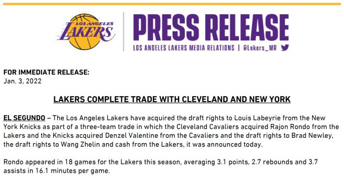 湖人、骑士和尼克斯达成一笔多人大交易,湖人把朗多送到克利夫兰得到路易斯-拉贝里的签约权,尼克斯得到瓦伦丁和110万美元;骑士得到朗多,通过这笔交易,湖人腾出一个阵容名额还省下了400万美元。