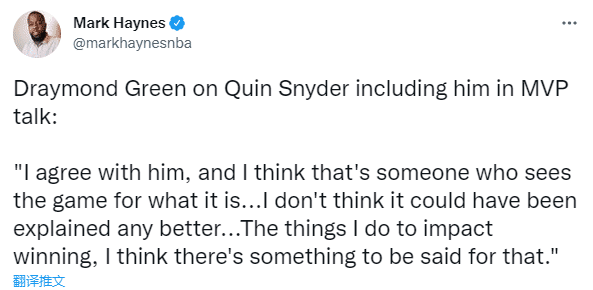 此前斯奈德曾盛赞格林:格林的独特性对勇士的影响不亚于其他任何球员,我认为,如果你想让某个人加入MVP的讨论,格林就是你要找的人……也许他的统计数据和其他球员不同,但他一直在按照自己的方式打球。
