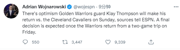 JRS直播01月04日讯 勇士官宣签约马刺旧将,名记曝汤普森预计将在1月10日对阵骑士比赛中复出,一旦勇士结束两个客场回到主场,他们将会做出最终的决定;换句话说,汤普森将在6天后复出,时隔2年多重返赛场。