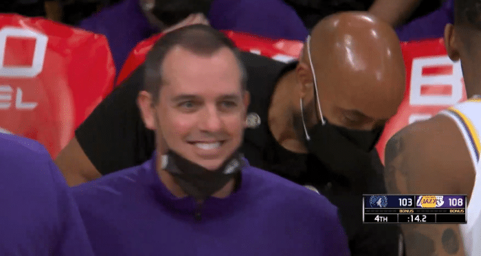 威少关键时刻出现致命发球五秒违例,直接把球权白送给森林狼;对此,沃格尔摘掉口罩并且露出无奈的笑容,一脸苦笑;湖人众将走回替补席,詹姆斯走到场边与沃格尔交流了一下,站在附近的威少一脸沮丧。