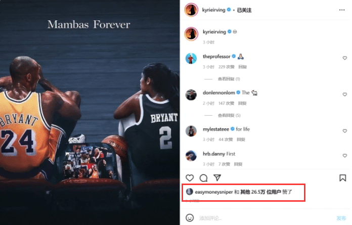 JRS直播01月03日讯 ,欧文又想念科比了,他在Ins上晒出科比父女同框合成照,照片上写着“曼巴永恒”,欧文晒照并配上一个无限的表情,杜兰特为欧文动态点赞。