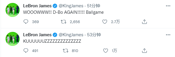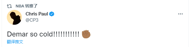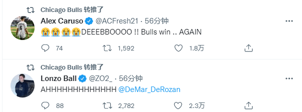 詹姆斯先是发推高呼库兹马的名字,为昔日兄弟庆祝;两分钟后,詹姆斯狂吹德罗赞:哇哦,德罗赞又绝杀了;太阳球星保罗直言德罗赞太冷血,郎佐-鲍尔和卡鲁索都第一时间发推盛赞;NBA众星膜拜德罗赞,公牛官方又直呼末节之王。