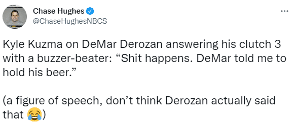 NBA新年的第一天,公牛和奇才上演开门大戏,德罗赞再次上演压哨三分绝杀,这一次的绝杀比上一场绝杀步行者还疯狂,赛后库兹马表示:屎事儿发生了,德罗赞让我拿好他的啤酒;言外之意是库兹马成为德罗赞表演的看客。