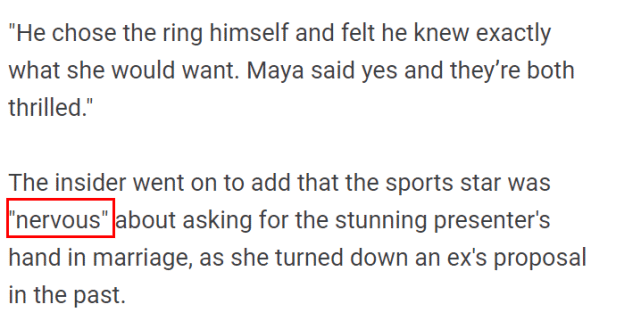 知情人还补充说:“西蒙斯对这次求婚感到紧张,因为玛雅过去曾拒绝过她前男友的求婚。”这对即将步入婚姻殿堂的情侣,还在上周举办了一次小型的家庭聚会,并证实了求婚的消息。