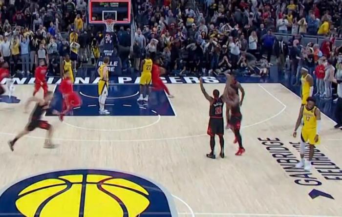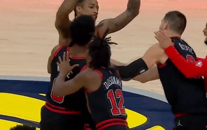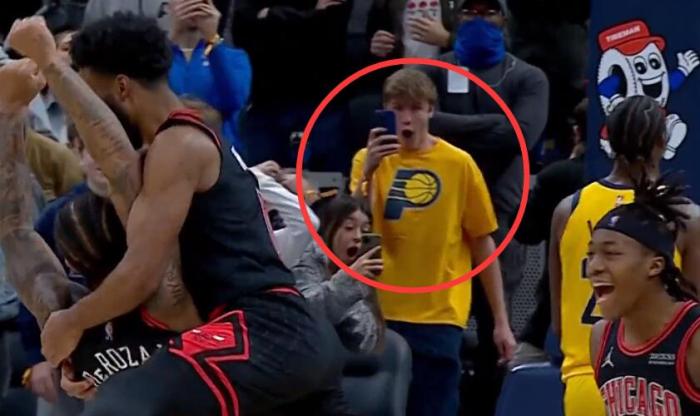 而当德罗赞将这球投进之后,公牛场上球员和替补球员,也都疯狂涌向德罗赞身边。德罗赞只是高举双臂,并没有做太过激动的庆祝动作。但这记绝杀实在是令人心潮澎湃!就连主队步行者的球迷,也为德罗赞的绝杀欢呼!一名在篮板后的观众,穿着步行者球衣的主队球迷,用相机记录下了德罗赞绝杀的一幕。而当绝杀完成后,这名球迷也不由自主地欢呼了起来!