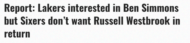 我被告知湖人给费城打过电话,他们说‘我们有兴趣得到本(西蒙斯)……’这是一个简短的谈话“,因为能够配平西蒙斯薪水的湖人球员只有戴维斯、詹姆斯或者威斯布鲁克。”Fischer说道,“霍顿-塔克、纳恩和一堆底薪合同是无法换来西蒙斯的。从字面上来理解,得到西蒙斯的唯一方式就是送走威斯布鲁克,但他不是76人想要的球员。”