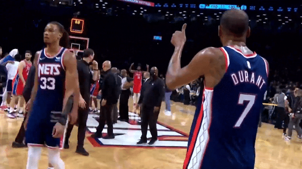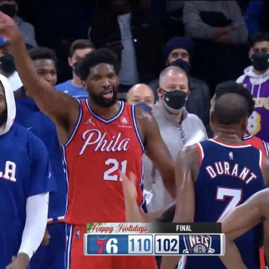 最后时刻,杜兰特和恩比德两人冲突,争吵互喷垃圾话,裁判和阿德赶紧拉开双方,最终他俩都吃到技术犯规;不过小冲突并没有就此结束,比赛结束后,恩比德和杜兰特仍旧交流了一番,杜兰特露出鬼魅一笑,并且离场前先是鼓掌,然后冲着恩比德竖起大拇指。