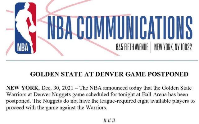 JRS直播12月31日讯 ,NBA官方宣布,由于掘金凑不足比赛最低要求的8名球员,今日勇士和掘金一战被迫延期。勇士球员都已经来到丹佛,但只能是白跑一趟。这是勇士本赛季第一场延期的比赛,是掘金本赛季第二场延期的比赛。赛季至今,NBA已经宣布11场比赛延期,上赛季,累计31场比赛延期。