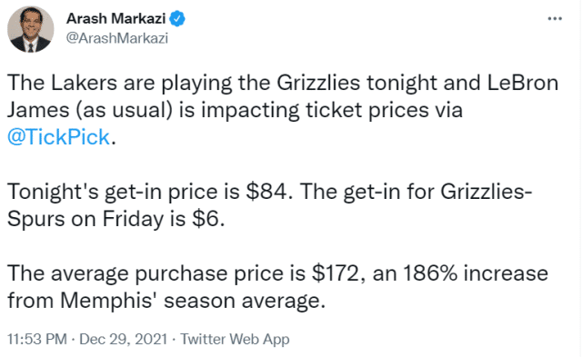 JRS直播12月30日讯 ,湖人球星勒布朗-詹姆斯的号召力有多大?从今天灰熊vs湖人的球票价格上就能看出来。据NBA记者Arash Markazi报道,周六灰熊vs马刺的最低票价是6美元,而今天灰熊vs湖人的最低票价高达84美元。Markazi表示,这场对湖人的比赛平均票价是172美元,和灰熊本赛季的平均票价相比,上涨幅度达到186%。