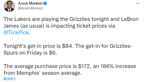 詹姆斯影响力太大,据美国记者Arash Markazi报道,詹姆斯效应一如既往地影响了灰熊主场比赛的票价,本场比赛的最低票价为84美元,而本周六灰熊主场对阵马刺的最低票价仅需6美元;今日比赛的平均票价为172美元,比灰熊本赛季的平均票价高出186%。