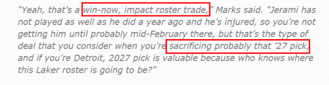 马克斯表示,如果他是湖人队,他会做这样的交易。“这是一个赢在当下,影响阵容的交易,”马克斯说,“格兰特的表现不如一年前,而且他受伤了,所以你可能要到2月中旬才能得到他。不过这是一笔你愿意考虑牺牲2027年首轮的交易。如果你是底特律活塞,2027年首轮是很有价值的,因为谁知道那时候湖人的名单是啥状况?”