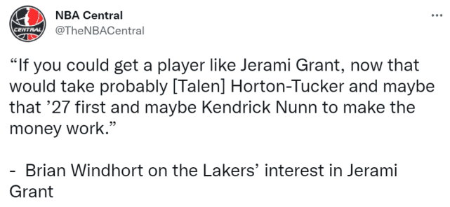 湖人要得到格兰特,需要付出怎样的筹码?文霍斯特说:“如果你能得到杰拉米-格兰特这样的球员,你可能需要才能让薪金配平。鲍比,如果你是湖人队,你会考虑这样的交易方案吗?因为这个球员可能会帮助球队更多。”