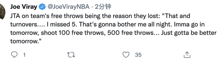 球队悍将安德森在赛后表示:“罚球和失误让我们输掉了比赛,我丢了5个,今晚睡不好觉了,明天我会去练100个罚球,500个罚球,明天会更好。”