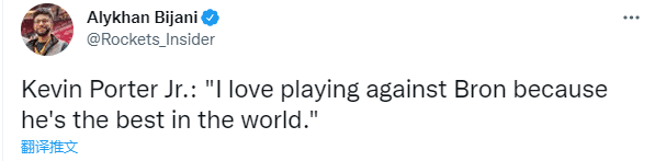 火箭新星小凯文-波特表示:我喜欢对抗勒布朗,因为他是世界上最好的球员。