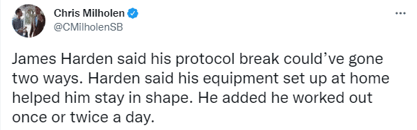 赛后哈登也透露自己隔离期间做的事情,登哥表示他在家里安装的训练设施帮助他保持身材,每天锻炼一两次。