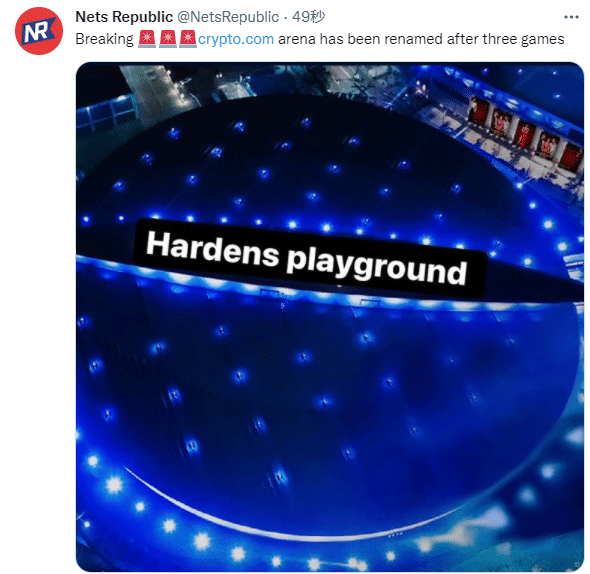 赛后,美媒Nets Republic晒恶搞照,并且发推写道:crypto球馆该更名为哈登球馆。