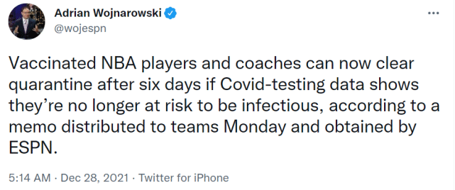 JRS直播12月28日讯 ,据ESPN报道,NBA官方已经分发给30支球队备忘录,如果新冠检测数据显示他们不再有传染风险,已接种疫苗的NBA球员和教练现在可以在6天后解除隔离。这意味着绝大部分球员和教练可以缩短隔离时间,但对于欧文这样拒绝接种疫苗的球员来说,要求隔离的时间没有变化。