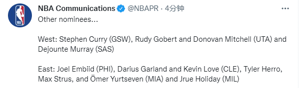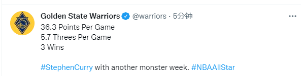 勇士官方发推为库里鸣不平,上周库里带领勇士拿到三连胜,场均轰下36.3分并且场均投进5.7记三分仍未获得西部周最佳。