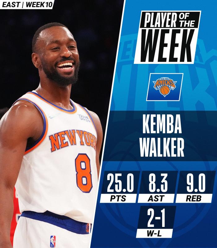 上周沃克带领尼克斯拿到2胜1负的战绩,场均轰下25分9篮板8.3助攻,重回首发之后打出全明星级别的表现——对阵活塞拿到21分8篮板5助攻,对阵奇才拿到44分9篮板8助攻的大号准三双,年终大战对阵老鹰拿到10分10篮板12助攻的三双,成为尼克斯队史第一位在年终大战轰下三双的球员。