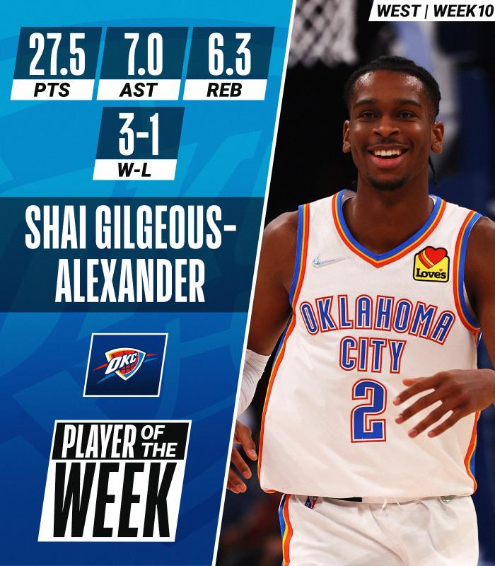 上周亚历山大带领雷霆拿到3胜1负的战绩,场均能够轰下27.5分7.5篮板6.3助攻——对阵灰熊拿到23分5篮板4助攻,对阵掘金拿到27分11了篮板12助攻,对阵太阳拿到29分5篮板7助攻,对阵鹈鹕砍下31分5助攻4篮板。