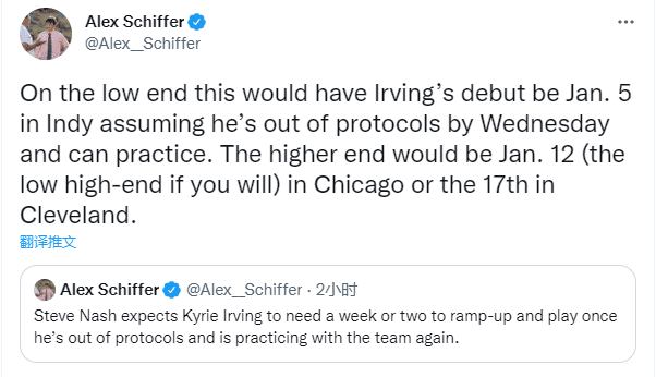 名记ALex Schiffer表示若欧文周四解除隔离并且归队训练,他最快将在1月6日复出(篮网客场对阵步行者),最晚1月13日客场对阵公牛复出,或者1月18日对阵骑士。