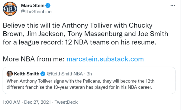 JRS直播12月27日讯 ,36岁老将安东尼-托利弗将和鹈鹕签下一份10天合同,2021-22赛季将是他的生涯第14季。记者Keith Smith表示,鹈鹕是托利弗效力的第12支球队,而记者Marc Stein表补充道:“生涯效力12支不同的球队,意味着托利弗追平了联盟纪录,此前,查基-布朗、吉姆-杰克逊、托尼-马森伯格、伊斯梅尔-史密斯和乔-史密斯都曾做到过。”