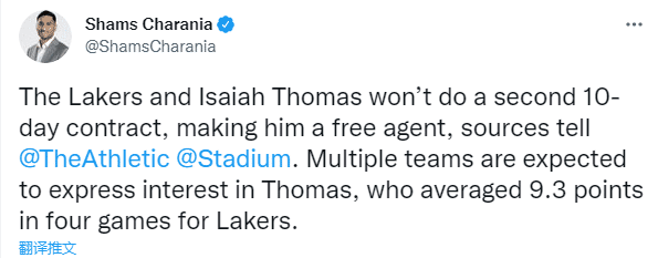 JRS直播12月27日讯 ,湖人惨遭五连败,小托马斯加盟后未尝一胜,上一场直接被弃用,据名记shams报道,湖人不会和小托马斯续签第二份十天短合同,后者将成为自由球员;预计多支球队有兴趣签下他。
