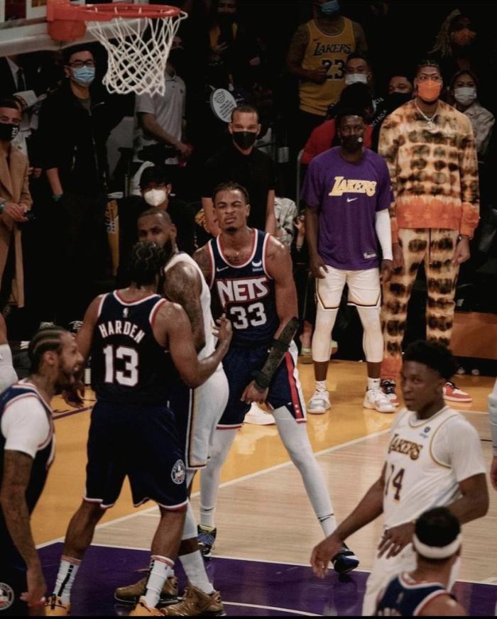 从现场高清照可以看出,篮网新星隔扣詹姆斯之后,他露出发狠的庆祝表情,詹姆斯-约翰逊为队友怒吼庆祝;詹姆斯和哈登两大巨星对视了一下,湖人替补席集体显得很沮丧,浓眉瞪大眼睛很抢镜,尤其是穿着一套很显眼的衣服。