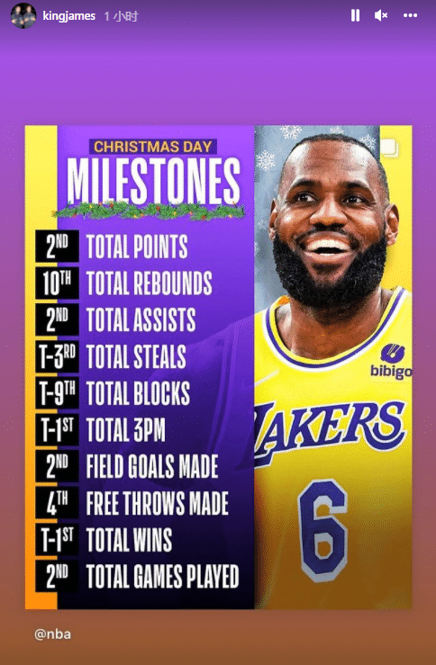 詹姆斯还在社交媒体上更新自己坐在车中自嗨的画面,戴着帽子和墨镜,还戴着王冠造型的钻石项链。詹姆斯还晒出自己在年终大战的十大纪录——总得分历史第2、总篮板历史第10、总助攻历史第2、总抢断历史并列第3、总盖帽历史并列第9、总三分命中数历史并列第1、总进球数历史第2、总罚球命中数历史第4、总胜场数历史并列第1和总参赛数历史第2。