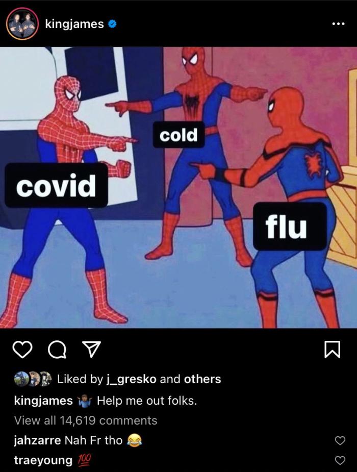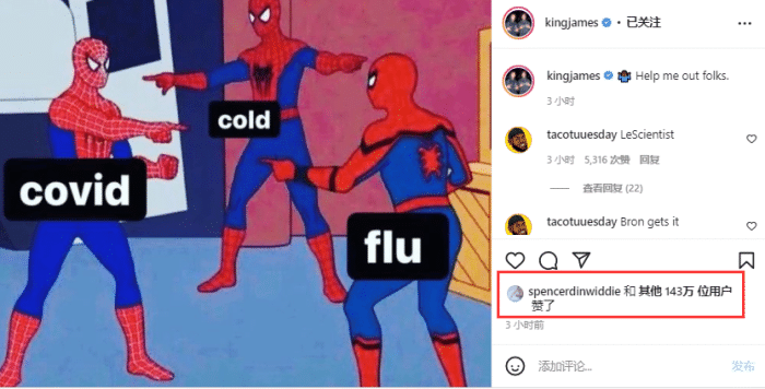 JRS直播12月25日讯 ,湖人当家球星詹姆斯更新Ins,在社交媒体上晒出一张图片,图片中出现3个蜘蛛侠,分别代表感冒、流感和新冠,老詹配文写道:请大家帮我摆脱困境(无奈表情)。