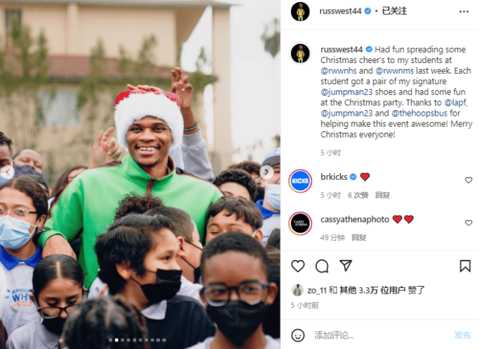 JRS直播12月25日讯 ,湖人球星威少在社交媒体上晒出他参加圣诞活动的视频和现场多张合影,并且配文写道:上周和同学们一起在圣诞活动中玩得很开心,到场的每名学生都得到了我的一双签名鞋,感谢赞助方让这次活动变得非常棒,大家圣诞快乐。