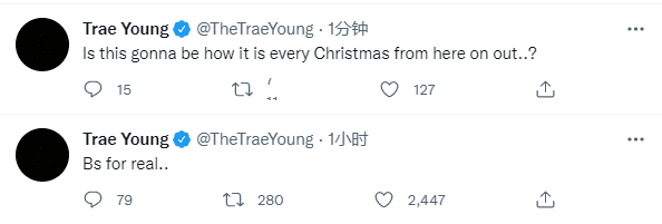 对于无法参加年终大战,特雷-杨更新推特表达了内心的不满,先是发推写道:真的是狗屁...;之后又发推:从今往后的每个圣诞节都会这样吗?