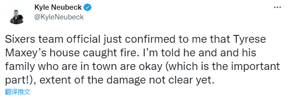 JRS直播12月25日讯 ,76人新星马克西遭遇意外火灾,据美记者Kyle Neubeck报道,76人球员泰雷斯-马克西家中着火了,76人官方已经证实这件事,如此突发状况真是太不幸,所幸马克西和他的家人都没事,这才是最重要的。