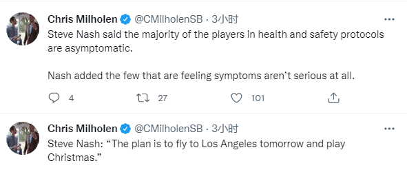 纳什透露,触发防疫协议的大多数球员都没有症状,少数有症状的也是轻微的。