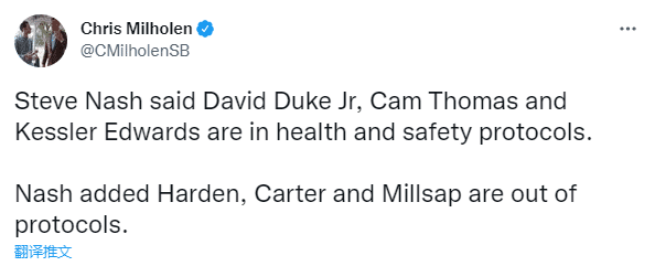 篮网队三名球员解除隔离,可又新增三名球员被隔离,目前篮网队内仍有10名球员被隔离——杜兰特、欧文、小布朗、夏普、阿德、本布里、约翰逊、小杜克、爱德华兹和托马斯。