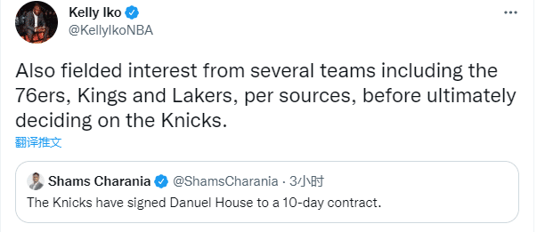 JRS直播12月24日讯 ,纽约尼克斯官宣签约火箭旧将丹妞尔-豪斯,双方签下10天短合同,不久前才被火箭裁掉便再就业;据名记Kelly Iko报道,湖人、国王和76人等多支球队也有意豪斯,但最终豪斯决定加盟尼克斯。