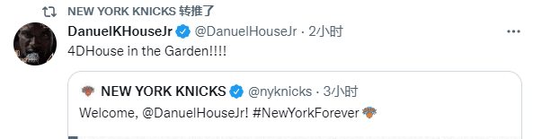 纽约尼克斯已经正式宣布签下豪斯,晒照并且发推写道:欢迎豪斯来到纽约;豪斯本人则发推回应:我已经来到麦迪逊花园球馆了。