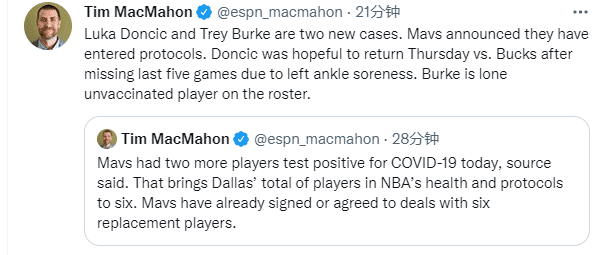 JRS直播12月23日讯,NBA又有一名球星确诊新冠,据名记Tim MacMahon报道,独行侠队东契奇和特雷-伯克的新冠检测呈阳性,确诊感染新冠,因此独行侠队被隔离人数增至6人。