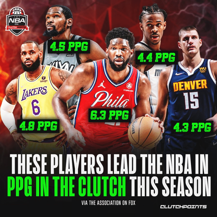 JRS直播12月23日讯,据美媒ClutchPoints统计,本赛季至今关键时刻场均得分排名前五榜单上,恩比德场均6.3分领跑联盟,詹姆斯场均4.8分力压杜兰特排名第二。