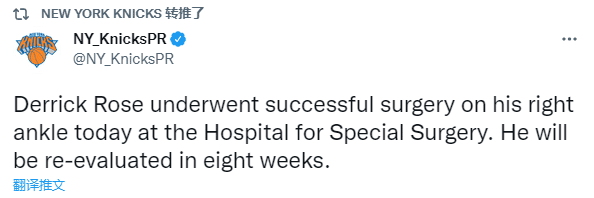 JRS直播12月23日讯,尼克斯折损一员大将,据名记shams报道,尼克斯球星德里克-罗斯成功接受右脚踝手术,至少伤停8周,之后尼克斯官宣,罗斯预计伤停两个月。