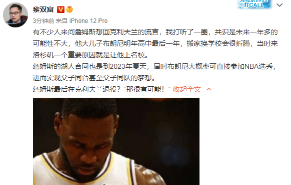 有不少人来问詹姆斯想回克利夫兰的流言,我打听了一圈,共识是未来一年多的可能性不大,他大儿子布朗尼明年高中最后一年,搬家换学校会很折腾,当时来洛杉矶一个重要原因就是让他上名校。