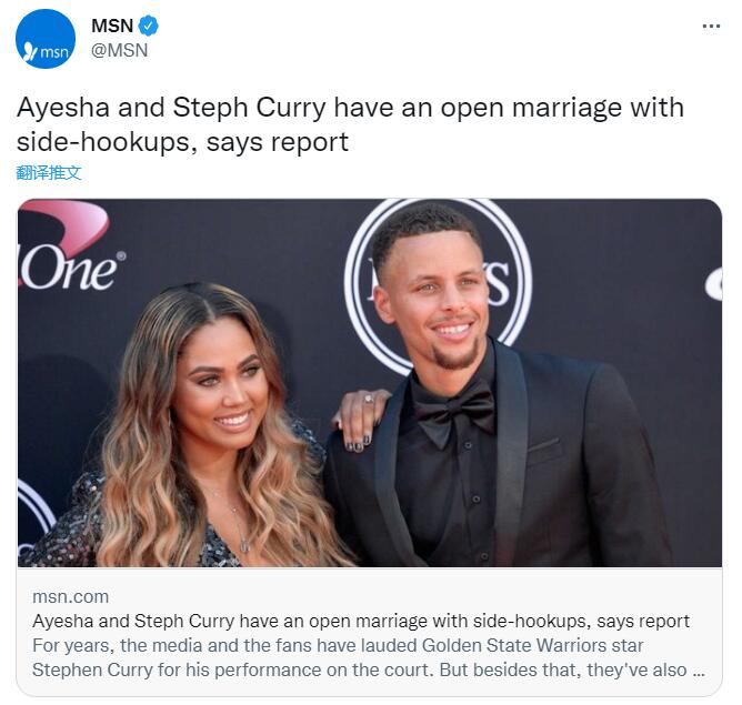 JRS直播12月22日讯 ,来自微软旗下的媒体爆出令人感到不可思议的消息。来自著名八卦页面Deuxmoi上的匿名消息显示:一直以来以好男人示人的勇士巨星史蒂夫·库里,和他的妻子阿耶莎在保持恩爱婚姻的前提下,各自婚姻中有“旁观者”的存在。这一消息目前并未得到两人证实,但已经冲上美国热搜。