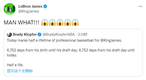 对此,詹姆斯本人转发了该统计,并且发推配文表示震惊和不可思议:MAN WHAT!!! (5个震惊表情)