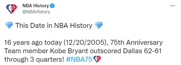 在2005年12月21日,也就是16年前的今天,NBA传奇球星科比-布莱恩特在对阵独行侠的比赛里打疯了,三节出战33分钟31投18中狂砍62分,三节62分比独行侠全队61分还多1分,典型的一个人打一支球队;当时湖人三节95-61领先34分,科比末节不再上场。