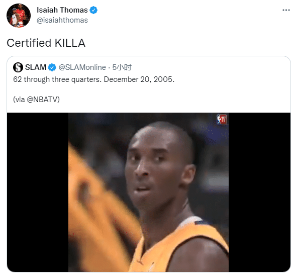美媒以及NBA官方社交媒体都发文怀念科比,湖人临时工小托马斯转发科比三节62分神迹,发推写道:认证的杀手。