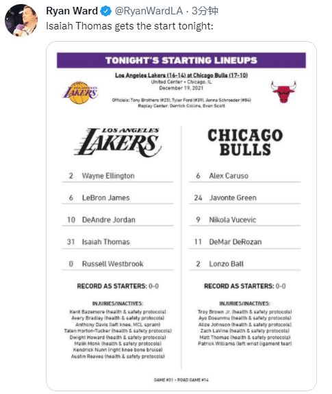 JRS直播12月20日讯 ,NBA常规赛湖人大战公牛,由于队内多达8名球员缺席比赛,湖人再次变阵,全新的首发五虎是詹姆斯、威少、艾灵顿、小乔丹和小托马斯,32岁小刺客一战证明自己,联手詹皇威少两大巨头首发出战,湖人本赛季第一次使用这套首发,也是赛季第16套首发。